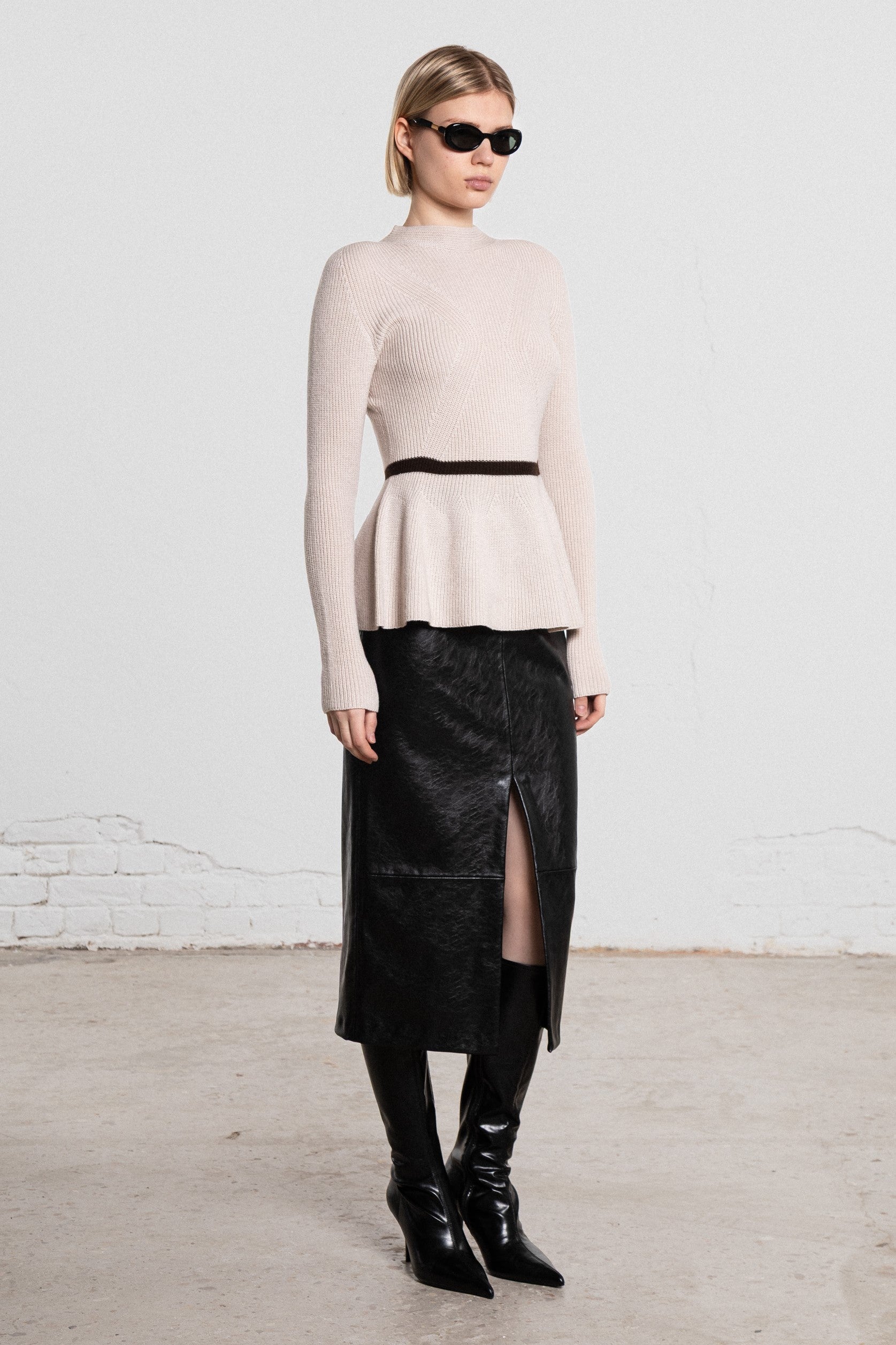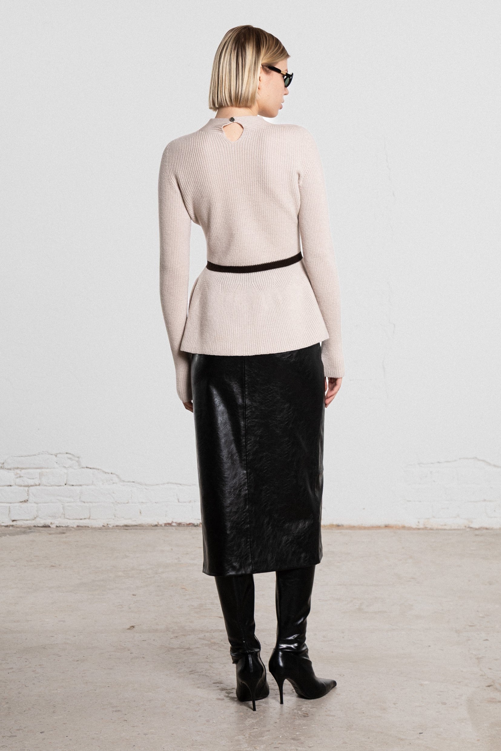 Knitted seamlessly, it follows the body with precision — gently contouring the upper silhouette before opening into a soft peplum that moves with ease. There is no tension, no excess — only balance.