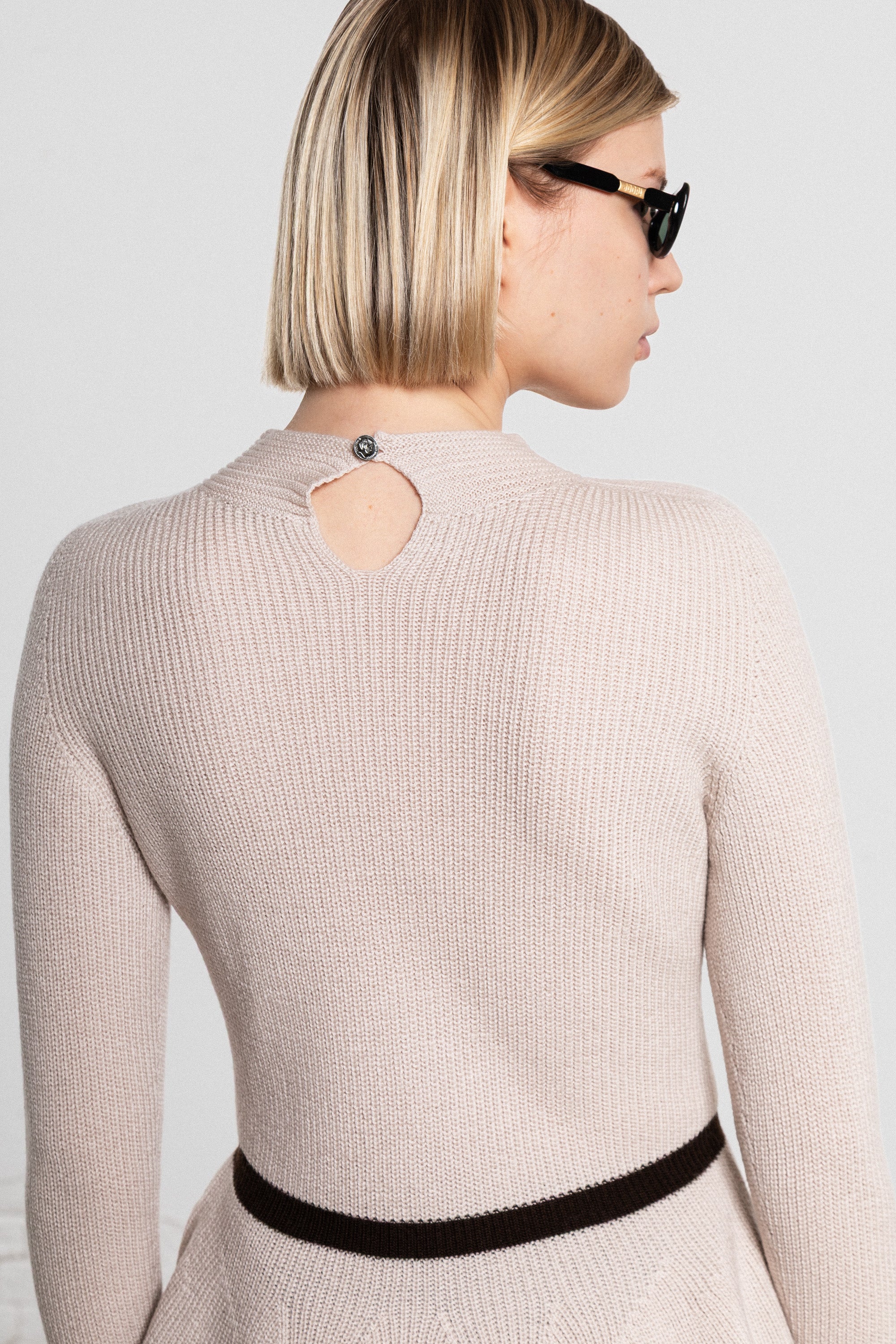 The structure is built directly into the knit. Directional ribbing subtly enhances natural lines, while the waist is quietly defined, creating a refined, feminine proportion without effort.