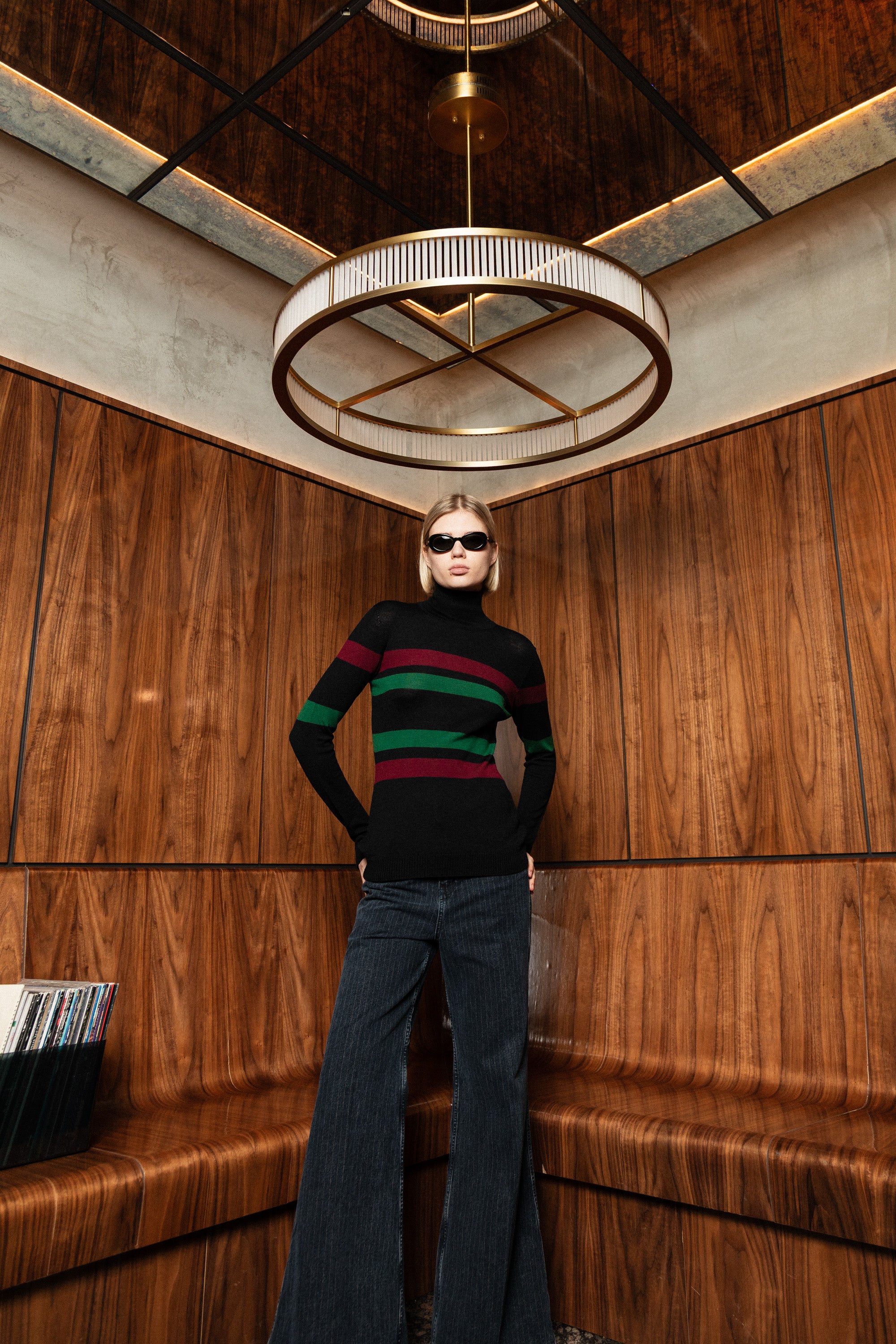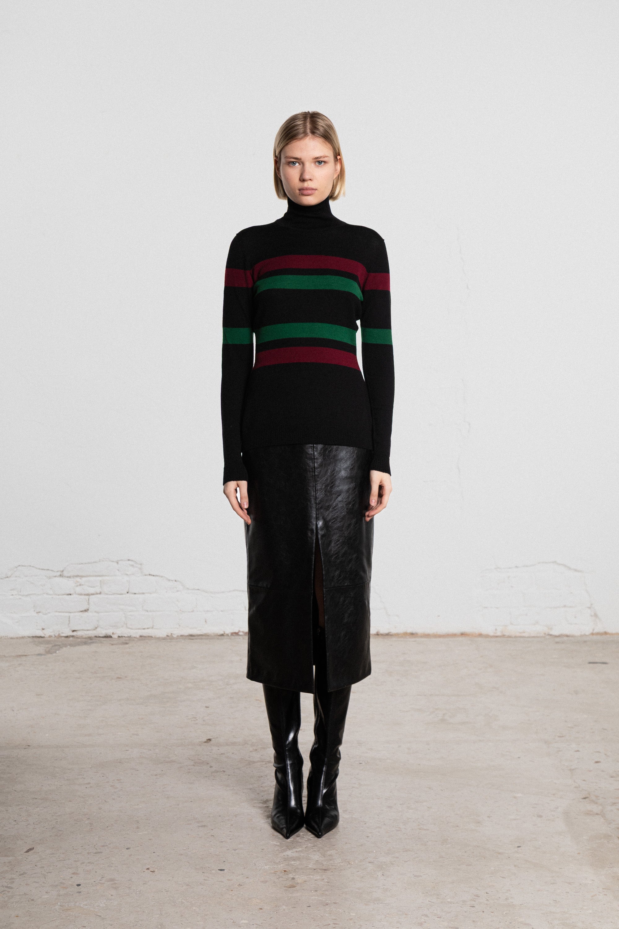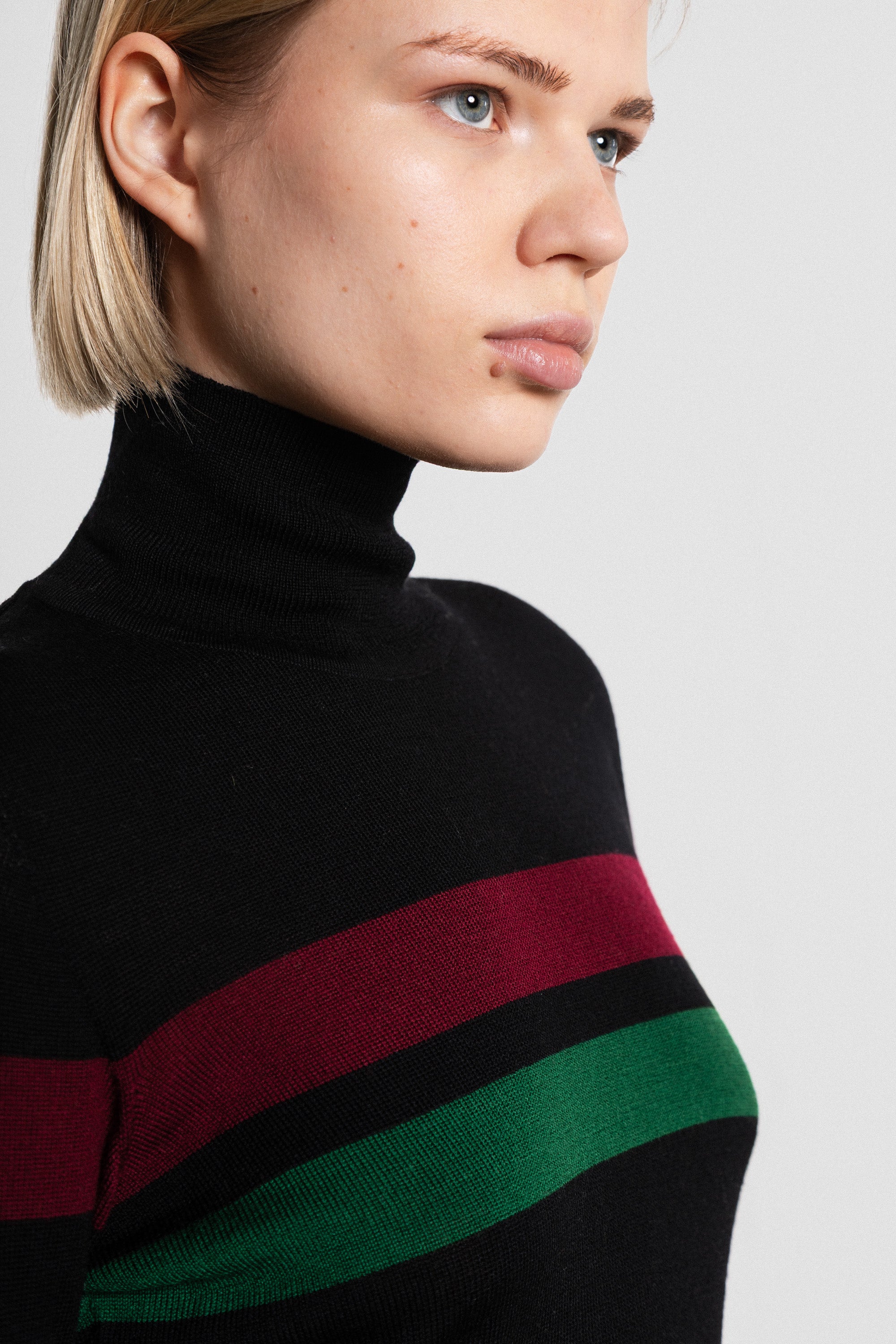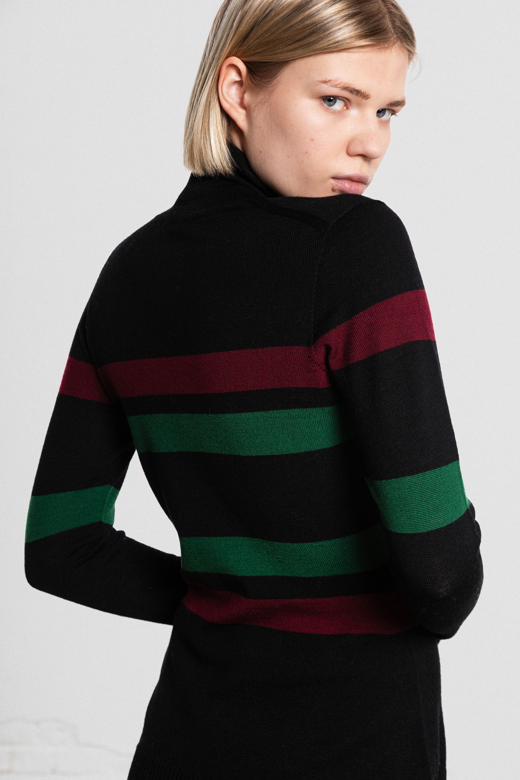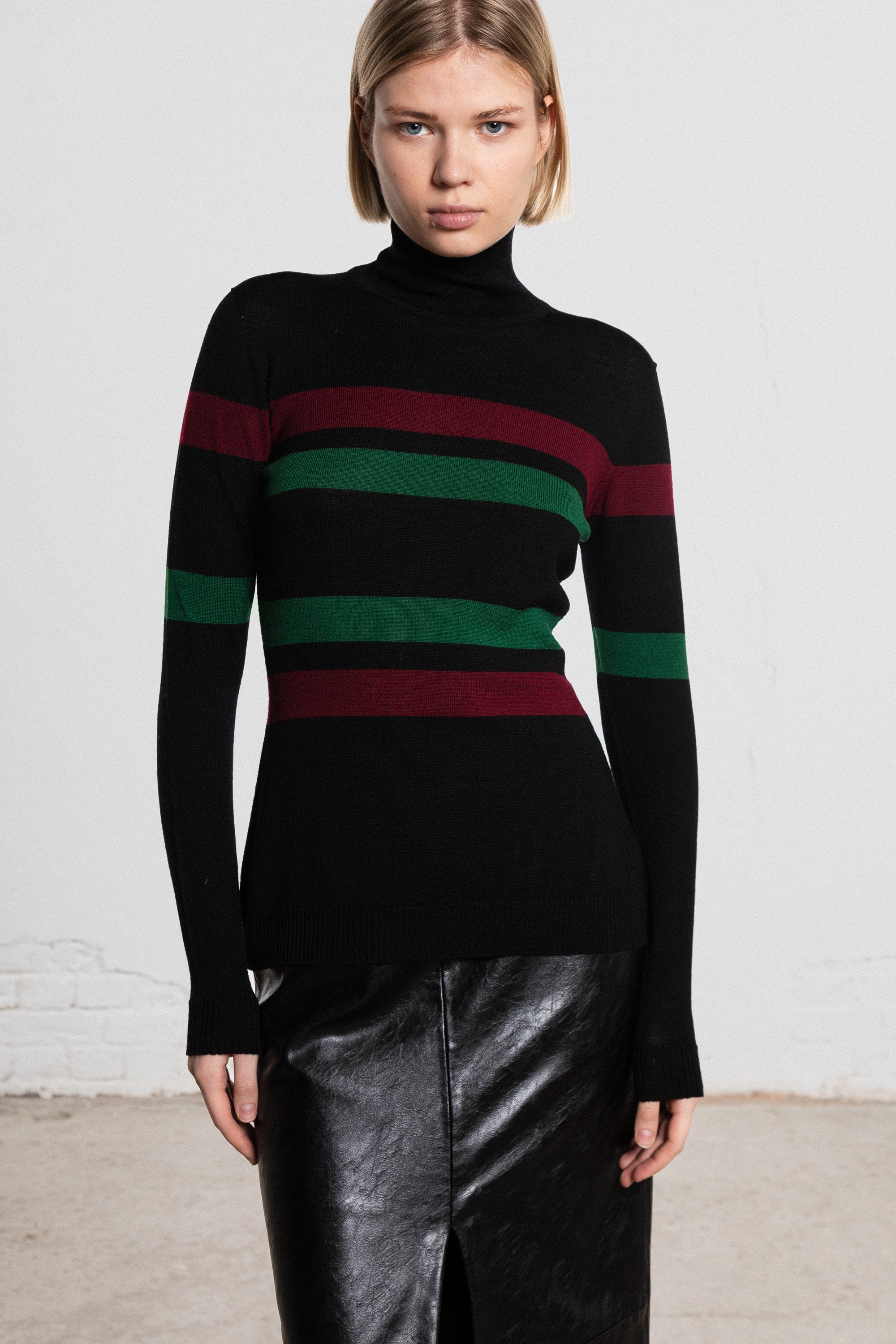 Architectural striped turtleneck knitted from extra fine merino wool.