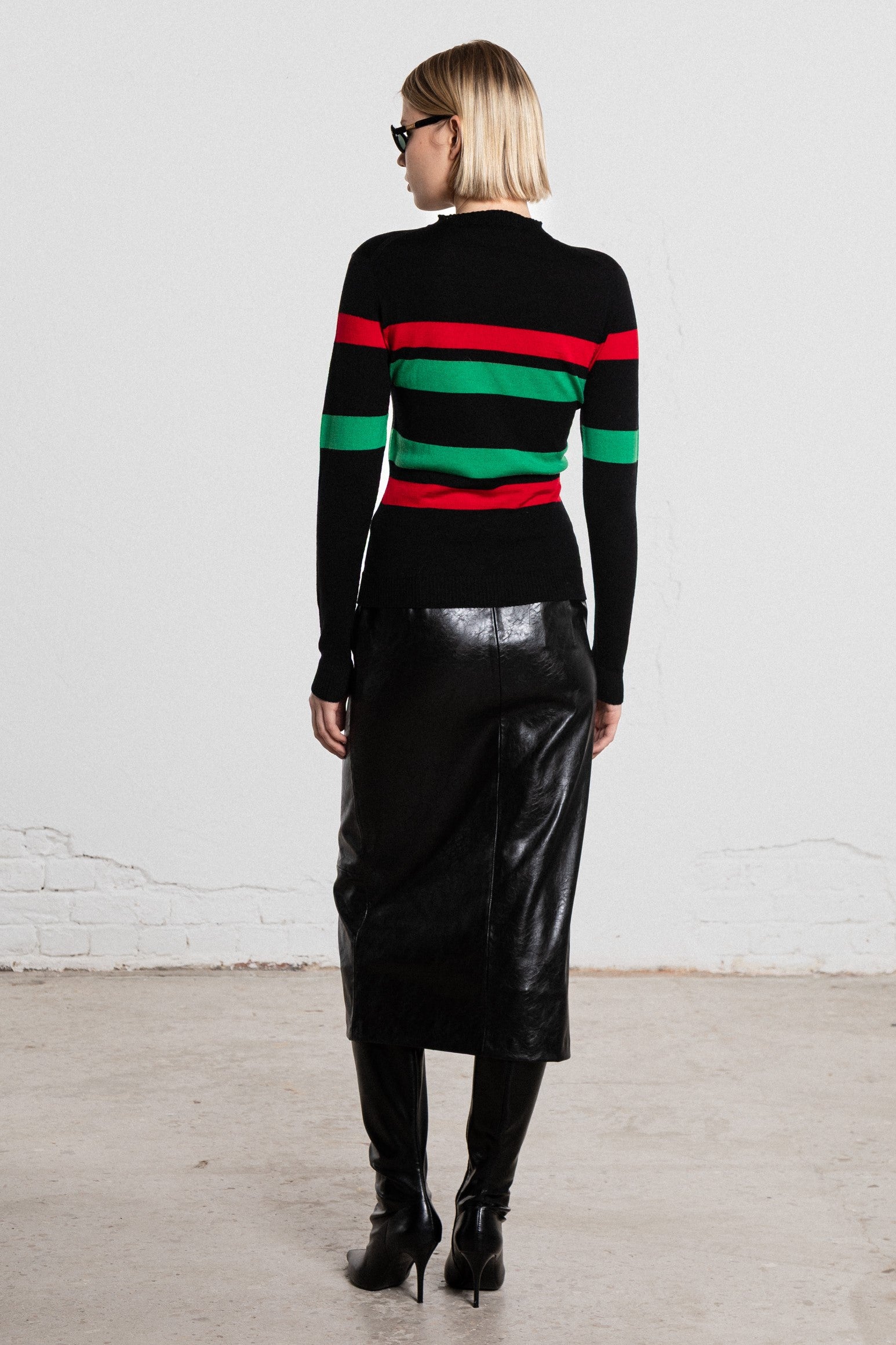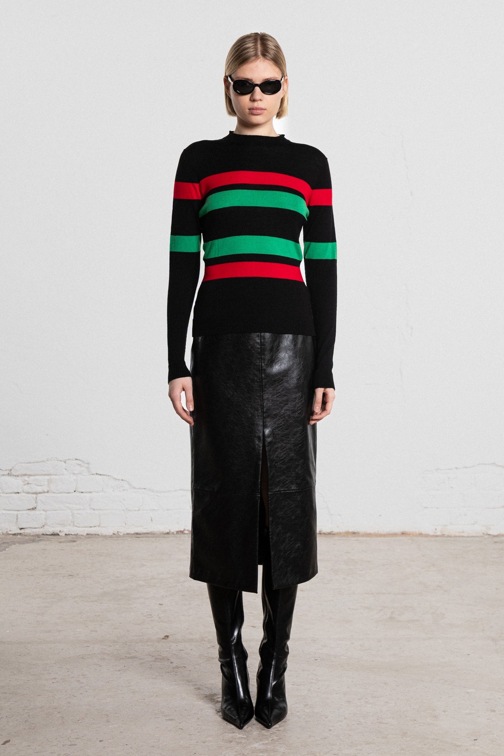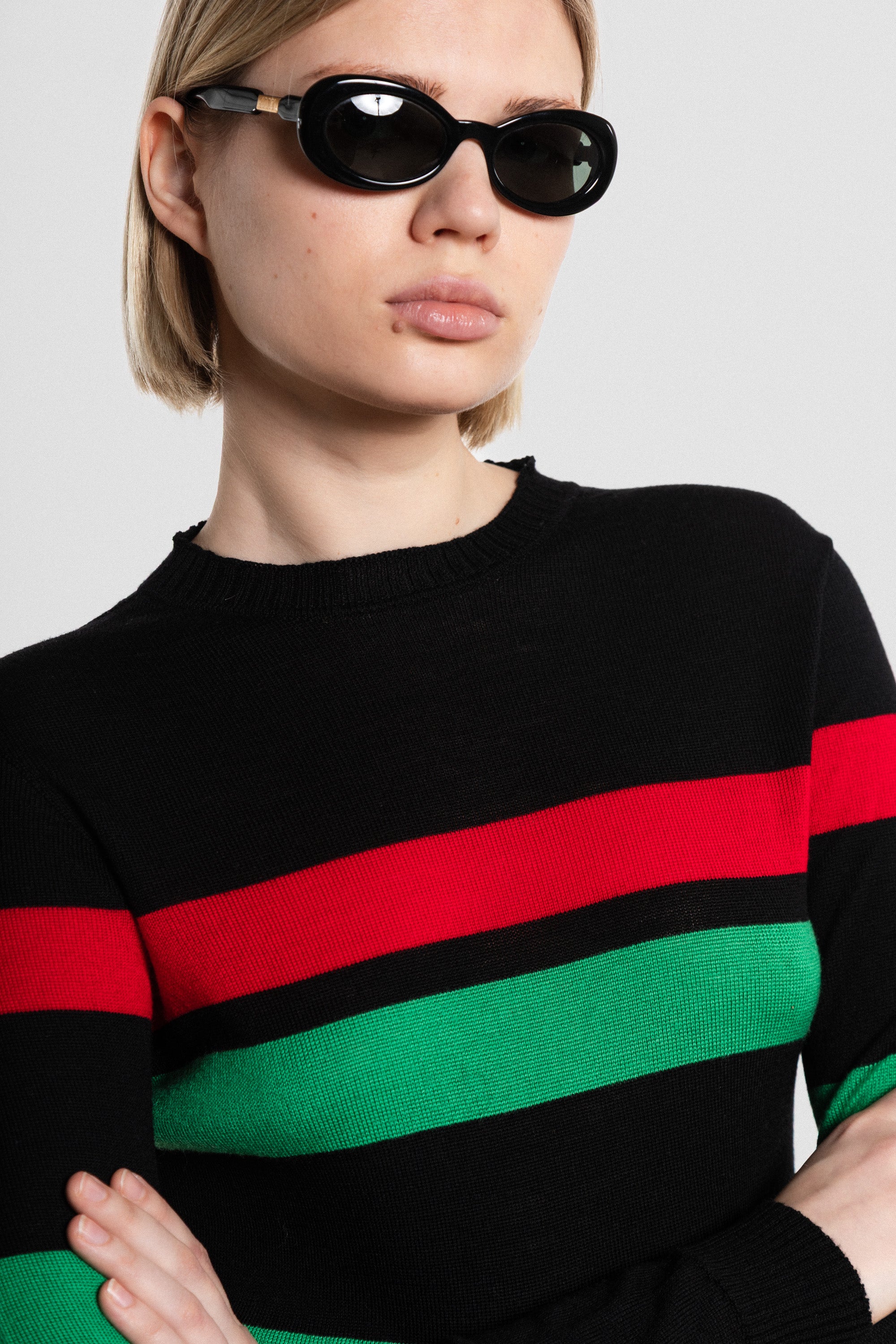 The engineered stripes create a visual rhythm — not just decorative, but intentional. They define the waist and subtly elongate the figure, enhancing proportions in a quiet, confident way.